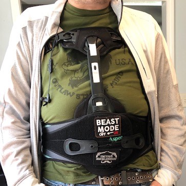 My back has taken a bit of a step back last couple days. Talking to the doctors last week’s treadmill was likely made possible by the absurd amount of steroids I have been on. Since they rolled back the steroids my back has been talking to me. It doesn’t have kinds words to say. All in all it’s better then it was a couple weeks ago, just need to wait longer for it to heal up. Next week I get another infusion for my bones which should supercharge the healing. In the meantime probably going to lay off the treadmill and back-flips for a bit . Speaking of the back this is the brace I am stuck until we get the new scans.