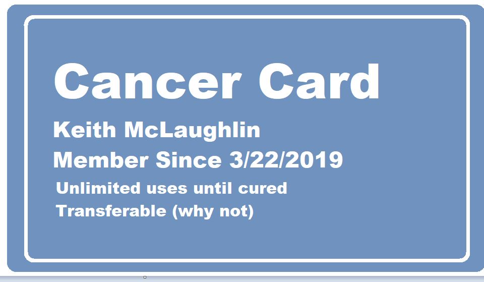 Not a lot new happening this week. As previously reported started treatment number 2 and working myself out of the brace. So far things are going well. This week we are going to talk about the pros and cons of having cancer. Yeah I know as previously reported cancer sucks, so how can there be pros? Everything can have upside if you look hard enough. We will start however with the easy part.