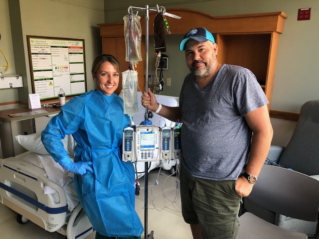 I just got me this picture with the nurse Fani, suited up for chemo and my new friend the IV stand. Apparently for the next 14 days me and that IV stand are going to be connected at all times. Yep when I shower Mr IV stand will be creeping on my outside the curtain. Yep all that stuff is running into my sleeve where there is a brand new set of piping. This set was put in Monday and pops out about an inch below where they pulled the six inch main from last week. At this rate they are going to install traffic lights in my neck to make sure none of these guys crash while laying the pipe. Oh yeah no Leroy pics this week if I don’t get see Leroy all week, you all will have to do without. It’s like you are going through treatment with me, except you are giving up cute dog pics and I am doing chemo. Also I got visitors, my aunt Susan stopped by and my proof readers went home to look after my pups so I am just firing this off.